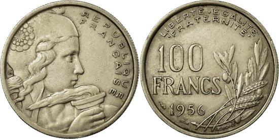 | | Coin, France, Cochet, 100 Francs, 1956, , Copper-nickel, KM:919.1 | | | Cochet, Liberty bust with torch right, Denomination above date at left, grain sprigs at right | | FEATURES |