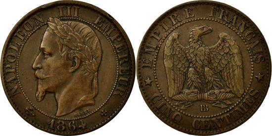 | | Coin, France, Napoleon III, Napoléon III, 5 Centimes, 1864, Strasbourg | | | Napoléon III, Laureate head left, Eagle | | FEATURES |