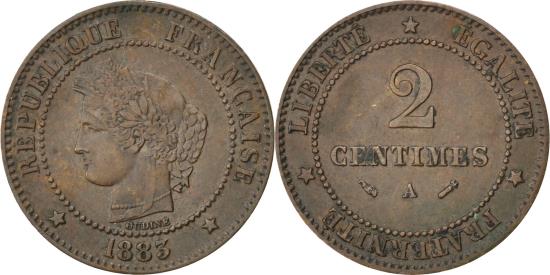 | | Coin, France, Cérès, 2 Centimes, 1883, Paris, , Bronze, KM:827.1 | | | Cérès, Laureate head left, Denomination | | FEATURES |