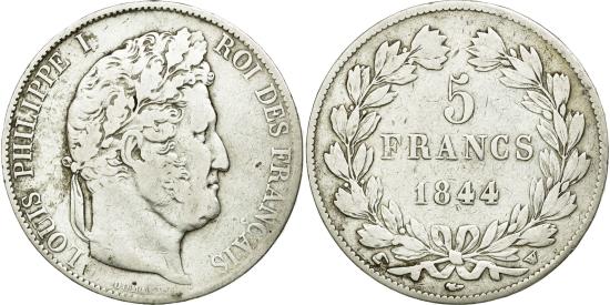 | | Coin, France, Louis-Philippe, 5 Francs, 1844, Lille, , Silver | | | Louis-Philippe, Laureate head right, Mint marks at edge outside wreath | | FEATURES |