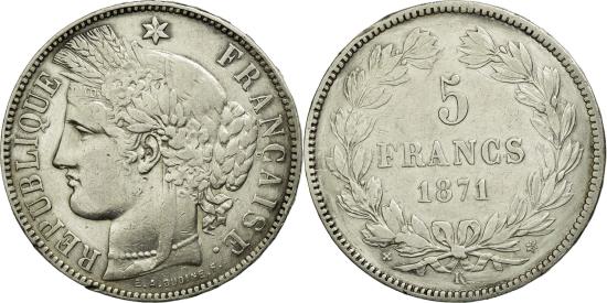 | | Coin, France, Cérès, 5 Francs, 1871, Bordeaux, , Silver, KM:818.2 | | | Cérès, E. A. OUDINE F. below truncation, Denomination within wreath | | FEATURES |