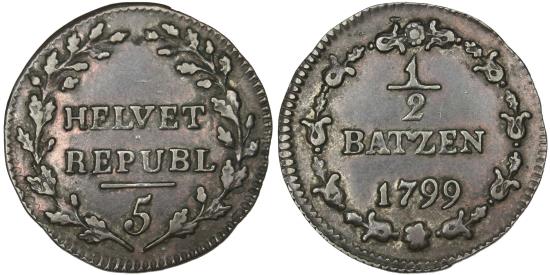 | | Coin, Switzerland, 1/2 Batzen, 1799, , Billon, KM:A6 | | | Inscription within sprigs, numeral 5 below, Value, date within designed wreath | | FEATURES |