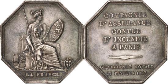 | | France, Token, , Silver | | | France sitting on right, holding a spear and a shield, LA FRANCE, COMPAGNIE / D'ASSURANCE / CONTRE / L'INCENDIE / A PARIS / ORDONNANCE ROYALE / 27 FEVRIER 1937. | | FEATURES |