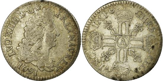 | | Coin, France, Louis XIV, 1/12 Écu aux 8 L, 1/12 ECU, 10 Sols, 1691, Paris | | | 1/12 Écu aux 8 L, Draped bust right, Eight crowned L's, cruciform, fleur-de-lis in angles | | FEATURES |