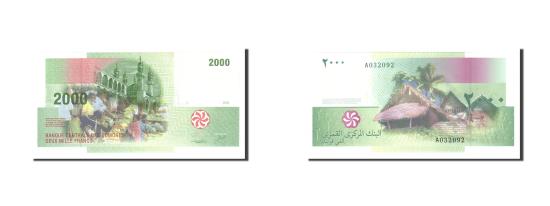 | | Banknote, Comoros, 2000 Francs, 2005, Undated, KM:17, UNC(65-70) | | | Mosque and market scene., Village huts., Green and multicolor. | | FEATURES |