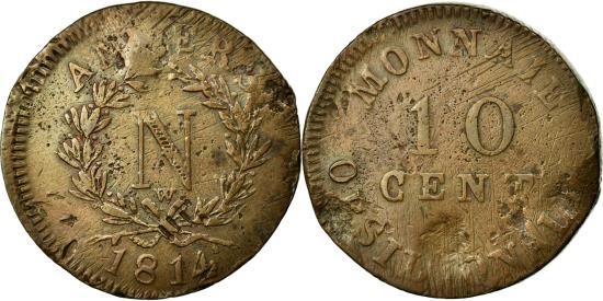 | | Coin, FRENCH STATES, ANTWERP, 10 Centimes, 1814, Antwerp, , Bronze | | | N monogram within wreath, W above ribbon bow, Denomination | | FEATURES |
