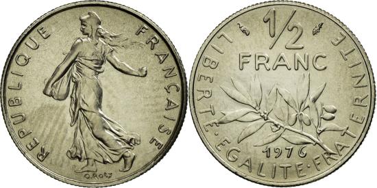 | | Coin, France, Semeuse, 1/2 Franc, 1976, , Nickel, KM:931.1, Gadoury:429 | | | Semeuse, The Seed Sower, Laurel divides denomination and date | | FEATURES |
