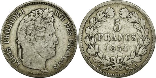 | | Coin, France, Louis-Philippe, 5 Francs, 1834, Limoges, , Silver | | | Louis-Philippe, Laureate head right, Mint marks at edge outside wreath | | FEATURES |