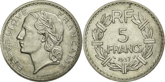 | | Coin, France, Lavrillier, 5 Francs, 1937, Paris, , Nickel, KM:888 | | | Lavrillier, Laureate head left, Denomination above date within sectioned wreath, Without mint mark. | | FEATURES |
