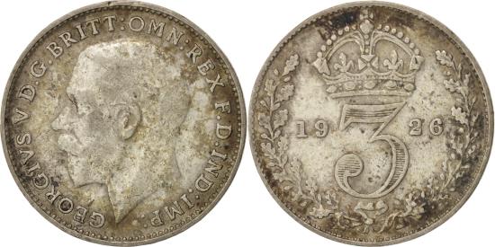| | Coin, Great Britain, George V, 3 Pence, 1926, , Silver, KM:813a | | | Head left, Crowned denomination divides date within oak wreath, Bertram MacKennal | | FEATURES |