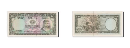 | | Banknote, Portuguese Guinea, 50 Escudos, 1971, UNC(65-70) | | | Issued note., Portuguese arms at upper center, N. Tristao at right., Woman standing, ships through the ages in background at left center, bank ship seal at lower left., Olive-green on multicolor underprint. | | FEATURES |