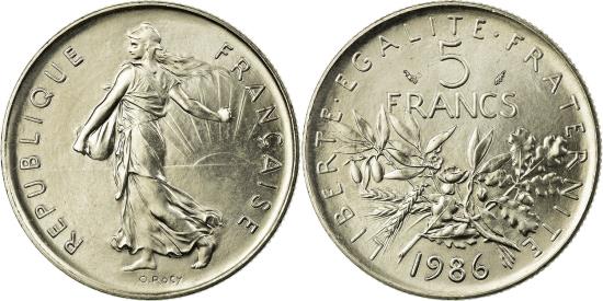 | | Coin, France, Semeuse, 5 Francs, 1986, , Nickel Clad Copper-Nickel | | | Semeuse, The Seed Sower, Branches divide denomination and date | | FEATURES |