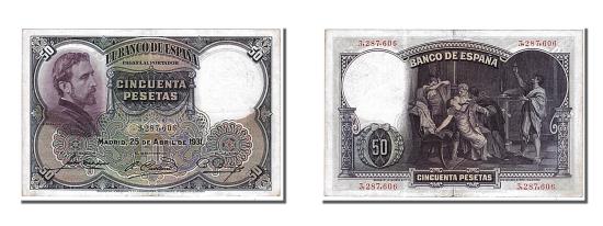 | | Banknote, Spain, 50 Pesetas, 1931, 1931-04-25, AU(55-58) | | | Eduardo Rosales at left., Rosales' painting The Death of Lucretia., Blue, lilac and violet. | | FEATURES |