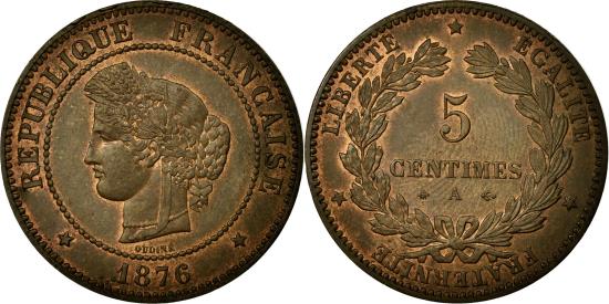 | | Coin, France, Cérès, 5 Centimes, 1876, Paris, , Bronze, Gadoury:157a | | | Cérès, Laureate head left, Denomination within wreath | | FEATURES |