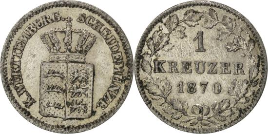 | | Coin, German States, WURTTEMBERG, Karl I, Kreuzer, 1870, , Silver | | | Crowned arms, Denomination and date within wreath | | FEATURES |
