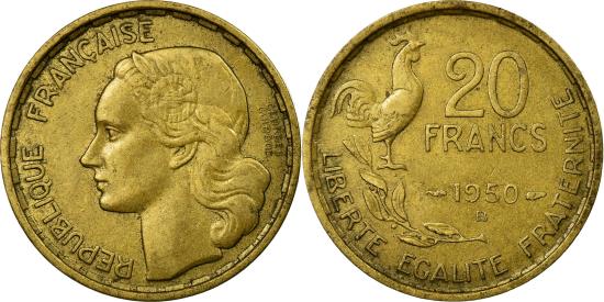 | | Coin, France, Guiraud, 20 Francs, 1950, Beaumont le Roger, | | | Guiraud, Head left, Rooster above laurel sprig, denomination at right | | FEATURES |