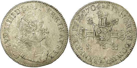 | | Coin, France, Louis XIV, 1/2 Écu aux 8L 2e type, 1/2 ECU, 45 Sols, 1704, Paris | | | 1/2 Écu aux 8L 2e type, Mailed bust right, 8 L's back to back, ends crowned, fleur-de-lis in angles | | FEATURES |