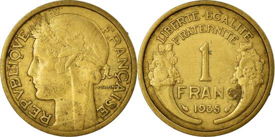| | Coin, France, Morlon, Franc, 1935, , Aluminum-Bronze, KM:885 | | | Morlon, Laureate head left, Cornucopias flank denomination and date | | FEATURES |