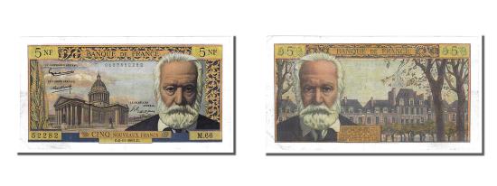| | Banknote, France, 5 Nouveaux Francs, 5 NF 1959-1965 ''Victor Hugo'', 1961 | | | Issued note., Panthéon in Paris at left, Victor Hugo at right,denomination: NOUVEAUX FRANCS (NF)., Vosges place at right, Victor Hugo at left., Blue, orange and multicolor. | | FEATURES |
