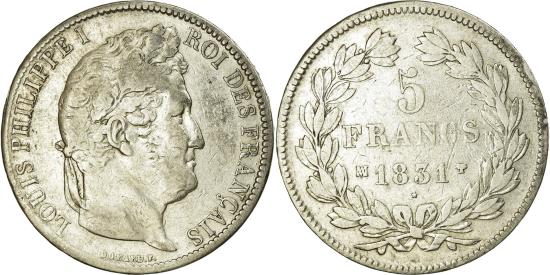 | | Coin, France, Louis-Philippe, 5 Francs, 1831, Marseille, , Silver | | | Louis-Philippe, Laureate head right, Denomination within wreath | | FEATURES |