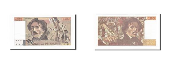 | | Banknote, France, 100 Francs, 100 F 1978-1995 ''Delacroix'', 1991, AU(55-58) | | | Signature D. Bruneel, B. Dentaud and A. Charriau. 1990-91., Eug<e>ne Delacroix at left center. Marianne holding tricolor, park of Delacroix's painting La Liberté Guident le Peuple at right. Like #153 but 100 CENT FRANCS retouched with heavier diagonal lines at upper left., Delacroix at right holding quill pen., Brown. | | FEATURES |