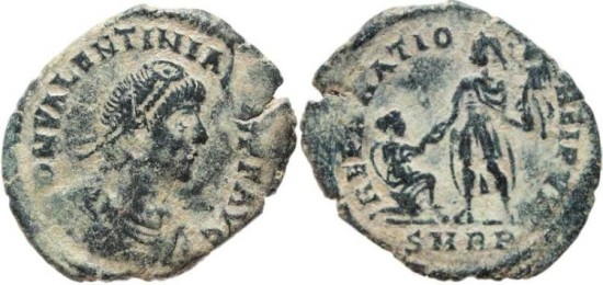 Obverse: DN VALENTINIANVS PF AVG, Pearl diademed draped and cuirassed bust of Valentinian II facing right