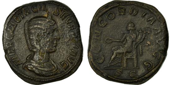 | | Coin, Otacilia Severa, Sestertius, Rome, , Bronze, RIC:203a | | | Otacilia Severa (249), Sestertius, Rome, , Bronze, RIC:203a, Diademed draped bust right, Concordia seated left, holding patera & double cornucopiae, MARCIA OTACIL SEVERA AVG, CONCORDIA AVGG, S C in exergue | | FEATURES |