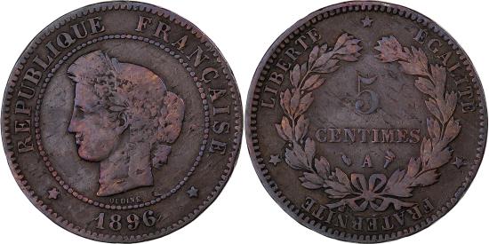 | | France, 5 Centimes, Cérès, 1896, Paris, Torch, Bronze, | | | Head of Ceres on the left, crowned with ears of corn and wearing a headband., Denomination within laurel wreath., Rare variety with a torch. | | FEATURES |