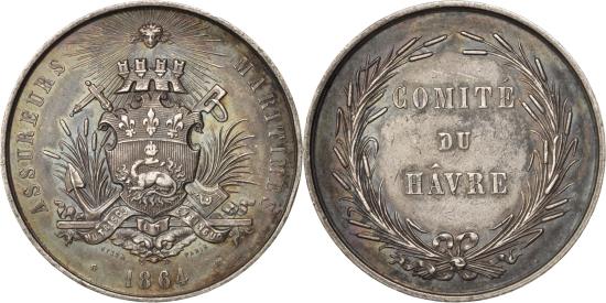 | | France, Token, Insurance, Assureurs maritimes, Comité du Hâvre, 1864, Stern | | | Coat of arms, Wreath, ASSUREURS MARITIMES * 1864, COMITÉ / DU / HÂVRE | | FEATURES |