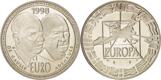 | | France, Medal, European coinage test, History, 1998, , Cupro-nickel | | | De Gaulle HEad accosted of Adenauer head right, Europe and flags, 1998 / EURO / DE GAULLE / ADENAUER, EUROPA | | FEATURES |