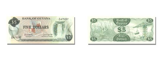 | | Banknote, Guyana, 5 Dollars, KM:22e, UNC(65-70) | | | Serial # prefix A/27 or higher. Signature 7 (1989)., Arms at center, Kaieteur Falls at right., Cane sugar harvesting at left, conveyor at right., Dark green on multicolor underprint. | | FEATURES |
