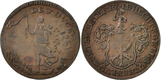 | | Germany, Token, Brunswick, J.B. Hecht, 1755, , Copper | | | Coat of arms, Abundancia walking left, I B HECHT K G R BR A C V F BR LVN MVNTZ MEISTER Z Z // 17 / 55, DEO DUCE | | FEATURES |