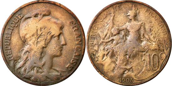 | | Coin, France, Dupuis, 10 Centimes, 1905, Paris, , Bronze, KM:843 | | | Dupuis, Liberty head right, Republic protecting her child, Without mint mark. | | FEATURES |