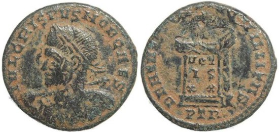 Obverse: IVL CRISPVS NOB CAES, laureate cuirassed bust left, spear across right shoulder, shield on left arm