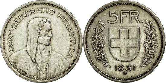 | | Coin, Switzerland, 5 Francs, 1931, Bern, , Silver, KM:40 | | | William Tell right, Shield flanked by sprigs | | FEATURES |