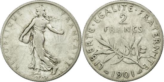 | | Coin, France, Semeuse, 2 Francs, 1901, Paris, , Silver, KM:845.1 | | | Semeuse, Figure sowing seed, Leafy branch divides denomination and date | | FEATURES |