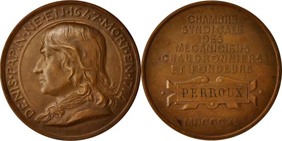 | | France, Medal, Denis Papin, Chambre syndicale des mécaniciens chaudronniers et | | | Bust left, Sidebar, DENIS . PAPIN . NE . EN . 1647 . MORT EN . 1714, CHAMBRE / SYNDICALE / DES / MECANICIENS / CHAUDRONNIERS / ET FONDEURS / PERROUX / MDCCCXL | | FEATURES |