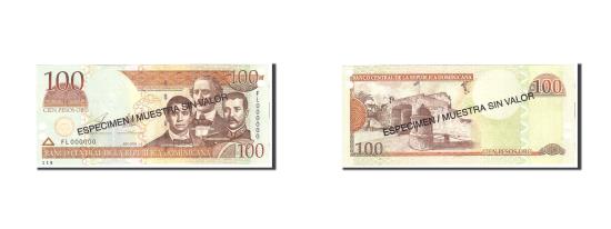 | | Banknote, Dominican Republic, 100 Pesos Oro, 2003, Undated, KM:171s3, UNC(65-70) | | | 2003. Specimen. Overprint: ESPECIMEN / MUESTRA SIN VALOR in black on both sides. Punch hole cancelled., F. R. Sanches, J. P. Duarte and M. R. Mella at right. Wide border printing at upper center right., Puerta del Conde at left., Dark brown and orange on multicolor underprint. | | FEATURES |