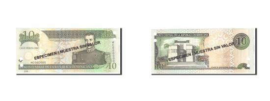 | | Banknote, Dominican Republic, 10 Pesos Oro, 2003, Undated, KM:168s3, UNC(65-70) | | | 2003. Specimen. Overprint in black: ESPECIMEN / MUESTRA SIN VALOR on both sides. Punch hole cancelled., Matí as Ramón Mella at right. Wide border printing at upper center right., Altar de la Patria., Dark green on multicolor underprint. | | FEATURES |