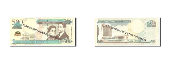 | | Banknote, Dominican Republic, 500 Pesos Dominicanos, 2011, Undated, KM:185s | | | Specimen. Overprint in black: ESPECIMEN / MUESTRA SIN VALOR once on each side. Punch hole cancelled., S.U. de Heriquez and P.H. Quziurena at right. | | FEATURES |