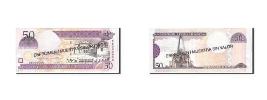 | | Banknote, Dominican Republic, 50 Pesos Oro, 2003, Undated, KM:170s3, UNC(65-70) | | | 2003. Specimen. Overprint: ESPECIMEN / MUESTRA SIN VALOR in black on each side. Punch hole cancelled., Santa Maria la Menor Cathedral at right. Wide border printing at upper center right., Basilica de Nuestra Se<nt>ora de la Altagracia at left., Purple and dark brown on multicolor underprint. | | FEATURES |