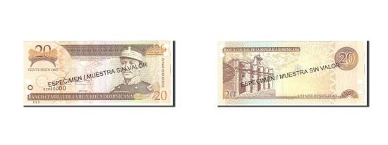 | | Banknote, Dominican Republic, 20 Pesos Oro, 2002, Undated, KM:169s2, UNC(65-70) | | | Specimen. 2002. Overprint: ESPECIMEN / MUESTRA SIN VALOR in black on both sides. Punch hole cancelled., Gregorio Luperon at right. Wide border printing at upper center right., Panteón Nacional at left., #170-174 wmk: Duarte., Brown on peach, green and multicolor underprint. | | FEATURES |