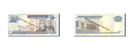 | | Banknote, Dominican Republic, 2000 Pesos Oro, 2009, Undated, KM:181s2 | | | 2009. Specimen. Overprint in black: ESPECIMEN / MUESTRA SIN VALOR once on each side. Punch hole cancelled., Emilo Prud Homme and José Reyes at right., Teatro Nacional at left., Black and blue on multicolor underprint. | | FEATURES |