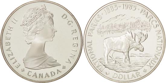 | | Coin, Canada, Elizabeth II, Dollar, 1985, Royal Canadian Mint, Ottawa, | | | Young bust right, Moose right, dates above, denomination below | | FEATURES |