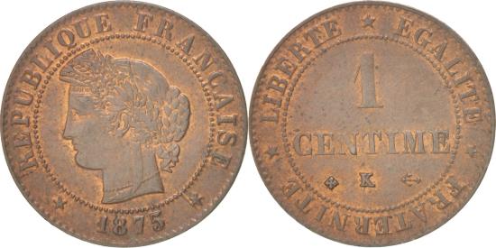 | | Coin, France, Cérès, Centime, 1875, Bordeaux, , Bronze, KM:826.2 | | | Cérès, Laureate head left, Denomination | | FEATURES |