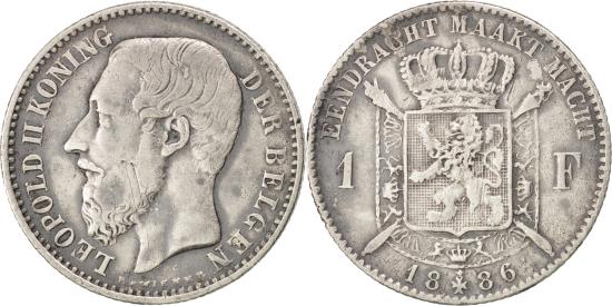 | | Coin, Belgium, Leopold II, Franc, 1886, , Silver, KM:29.1 | | | Head left, legend in Dutch, Crowned arms on ornate shield divide denomination, LEOPOLD II KONING DER BELGEN | | FEATURES |