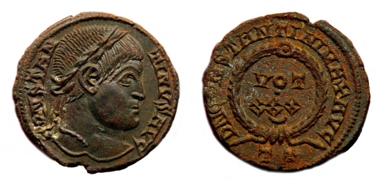Obverse: CONSTANTINVS AVG. Laureate head right. Reverse: DN CONSTANTINI MAX AVG around VOT XXX crescent in three lines within wreath. Mintmark TT in exergue. Excellent exemplar, pratically uncircullated, in EF+/EF condition, conserving absolutely full details in both sides till the least one. Superb portrait of Constantine I. Choice! RIC VII Ticinum 174 T. Ticinum mint, A.D. 325. 3,0 g - 17 mm --------------------------------------------------------------------------------- Visit our new web-blog aeternitas-numismatics.com |
