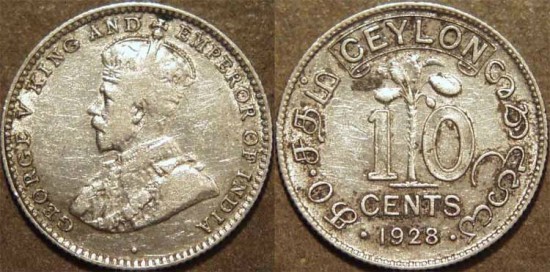Palm tree, "Ceylon" within an ornamental scroll above, the denomination "10 cents" in English (center), Tamil (at left) and Sinhalese (at right), date below: 1928