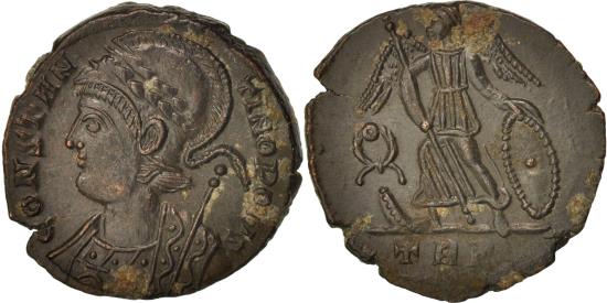 | | Coin, Constantine I, Nummus, 332-333, Trier, , Copper, RIC:VII 554 | | | Laureate and helmeted bust of Constantinopolis left, wearing imperial mantle, holding reversed spear, No legend, Victory standing facing on prow, head left, holding sceptre and resting left hand on shield. Wreath in left field. Mintmark TRP, CONSTAN-TINOPOLIS | | FEATURES |