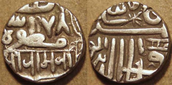 Legend imitating the coins of Sultan Muzaffar III of Gujarat with frozen AH date 978 and Nagari legend below: